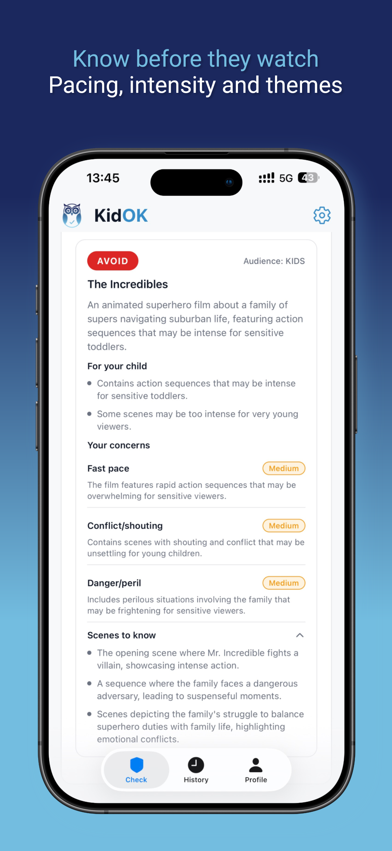 KidOK is a mobile app built for fast parental decisions about shows, movies, YouTube content, and games. The workflow is simple: search a title and get a safety summary with age guidance, key warnings, and overstimulation context in seconds.